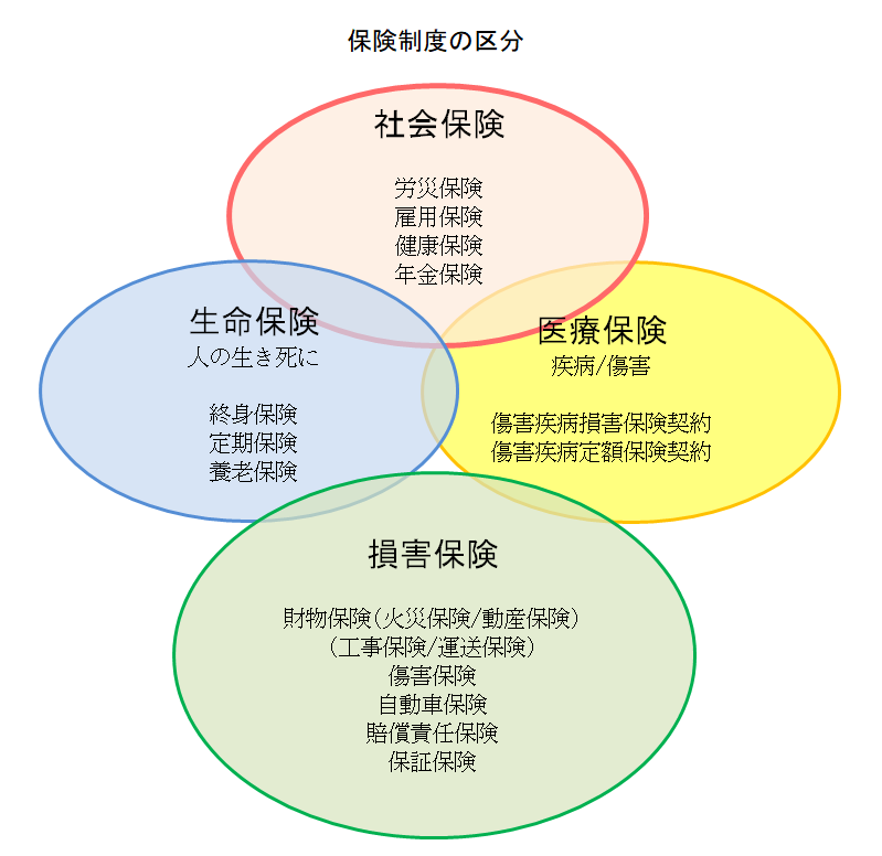 公的保険制度の「 社会保険」と民間保険制度の「損害保険」「生命保険」「医療保険」があります。