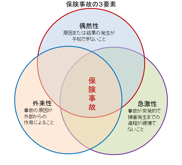 損害保険対象の事故とは原則以下の「偶然性」「急激性」「外来性」の3要素が必要です