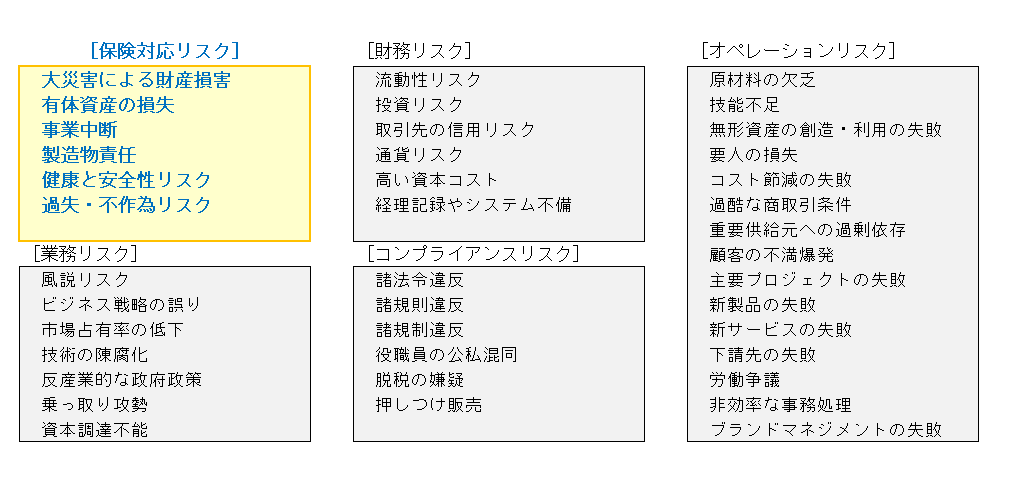 どこに、どのようなリスクが潜在しているかのハザードの確認です TOPもどる 大災害による財産損害 洪水/土砂崩れ/高潮/突風/地震/噴火/津波災害 など 有体資産の損害 建物・造作設備/什器備品/商品・製品・原材料/受託品/借用品 など 事業中断 火災事故休業/イベント悪天候中止 など 製造物責任 食中毒事故/引渡後の販売商品・製品や仕事の結果の安全欠陥事故 など 健康と安全性リスク 労務災害/疾病/傷害 など 過失・不作為リスク 対人賠償事故/対物賠償事故/休業損害補償 など